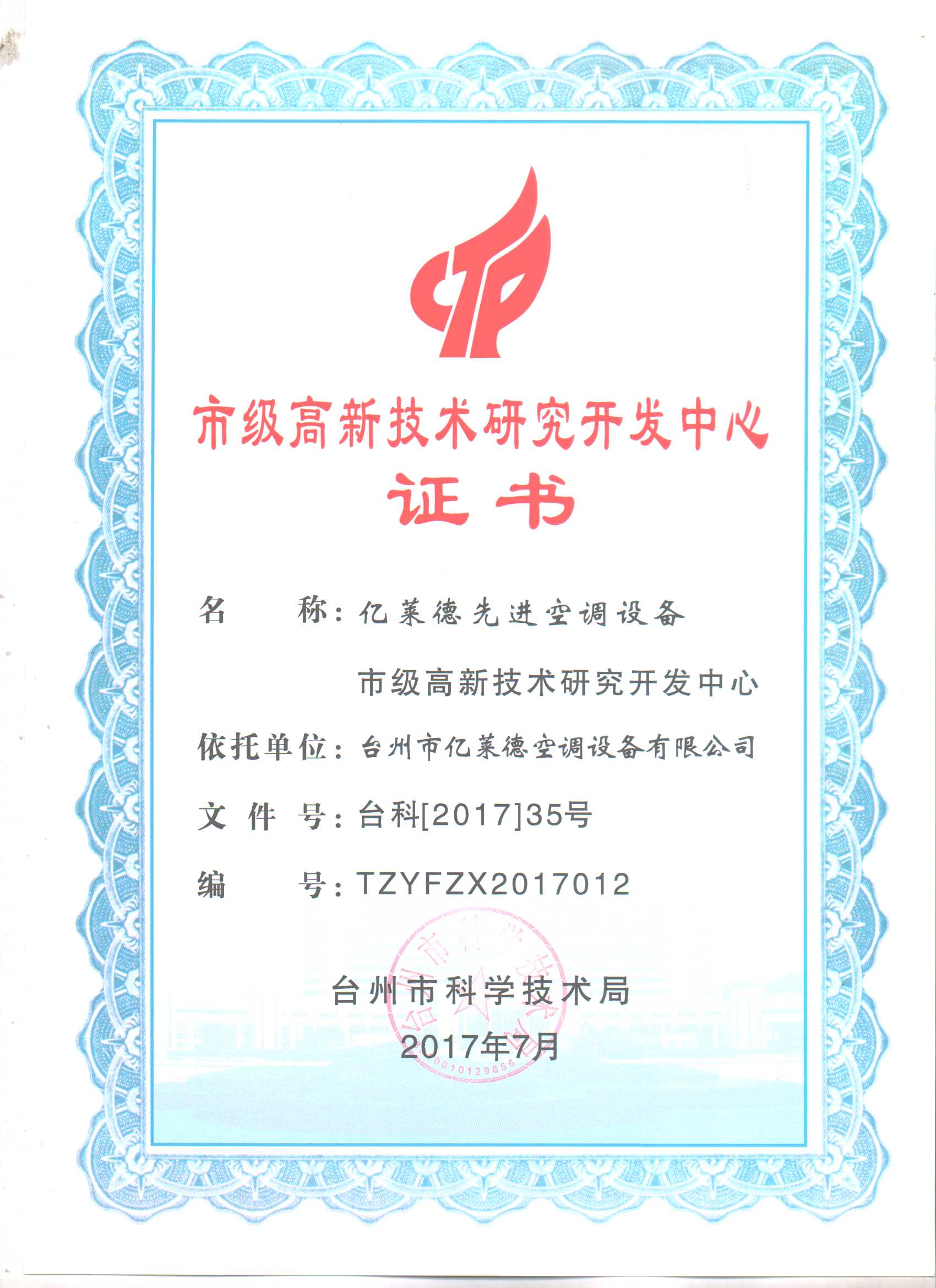 臺州市級高新技術企業(yè)證書