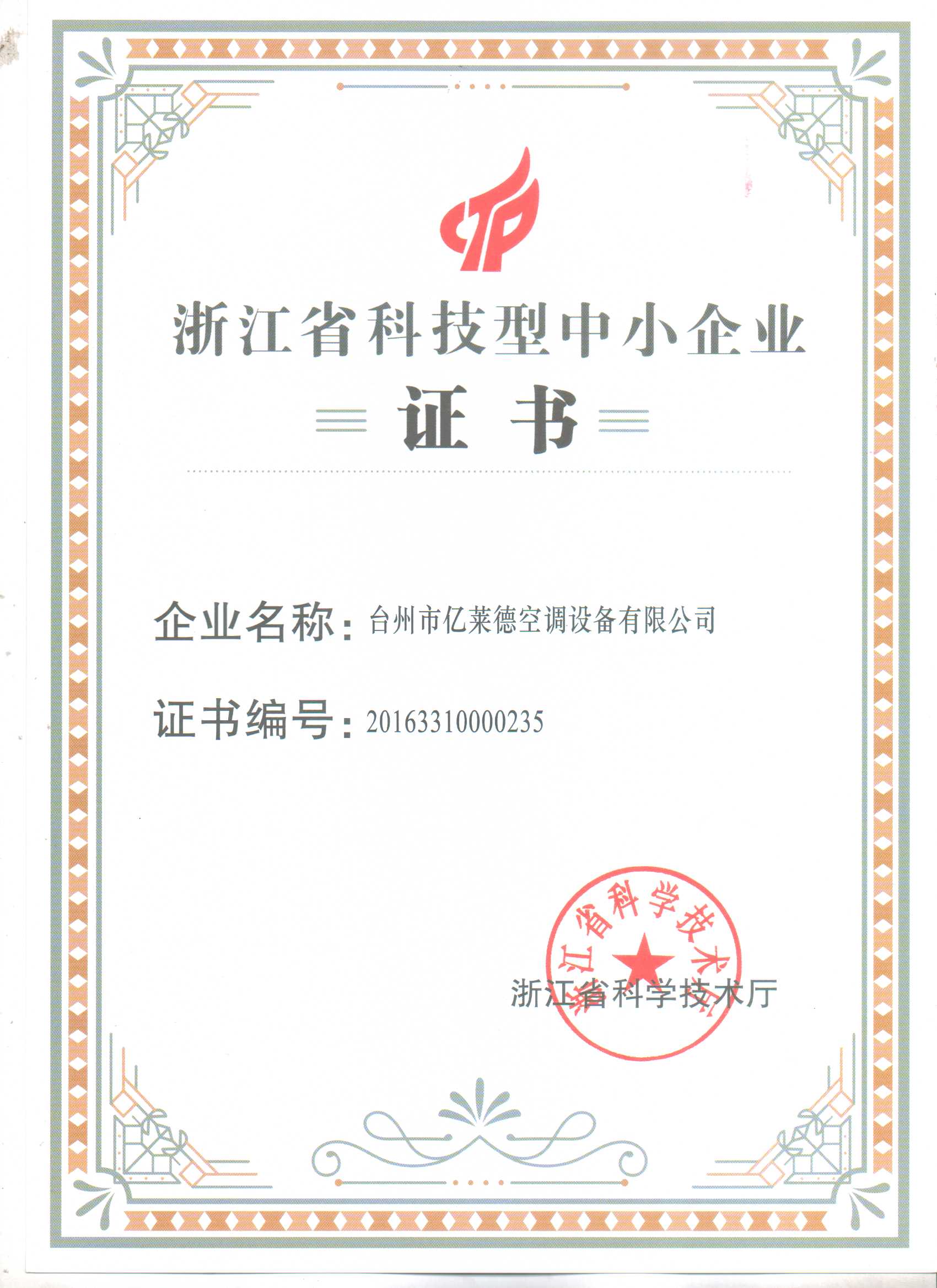 浙江省科技型中小企業(yè)證書