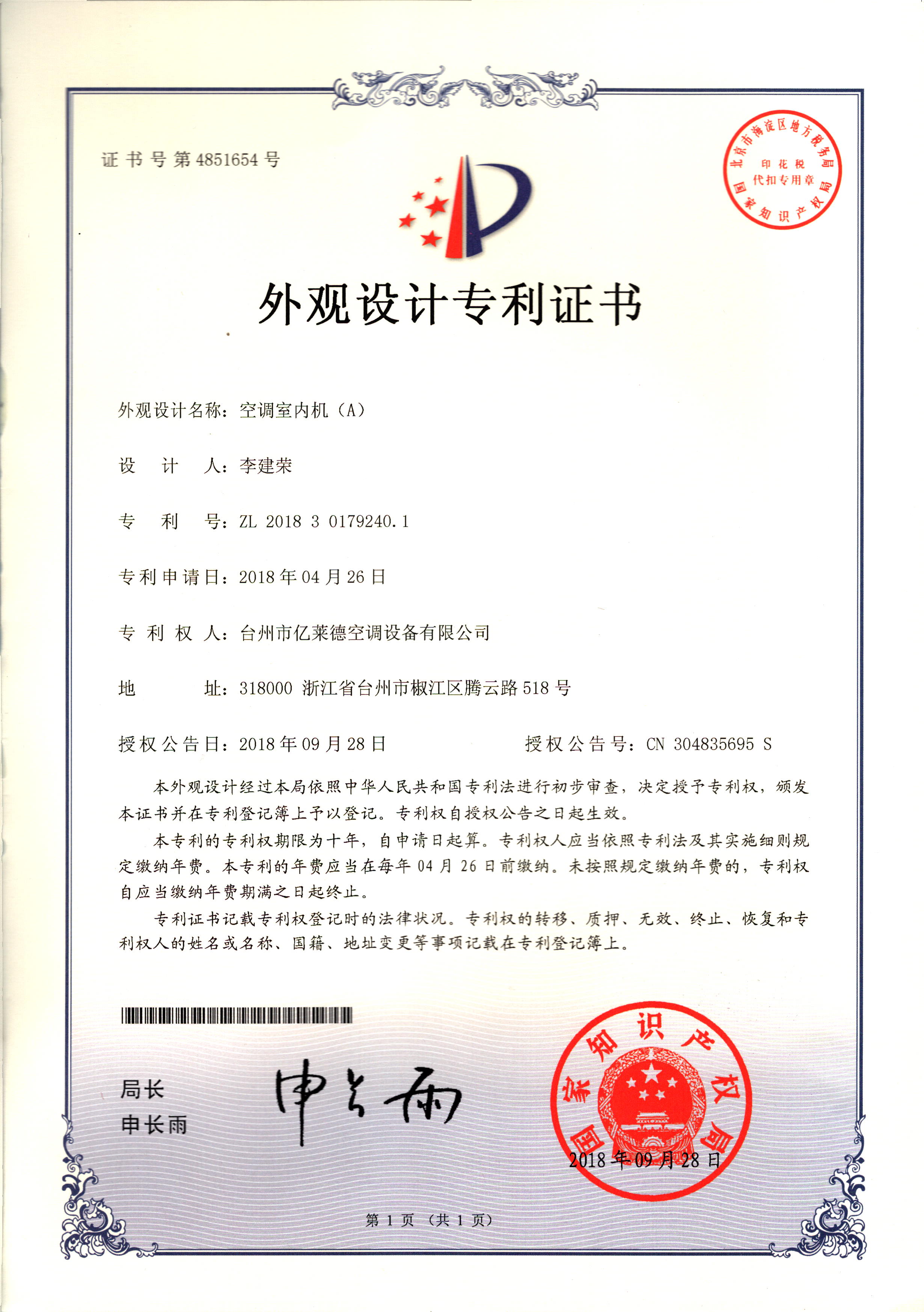 外觀設計專利證書--空調(diào)室內(nèi)機(A...