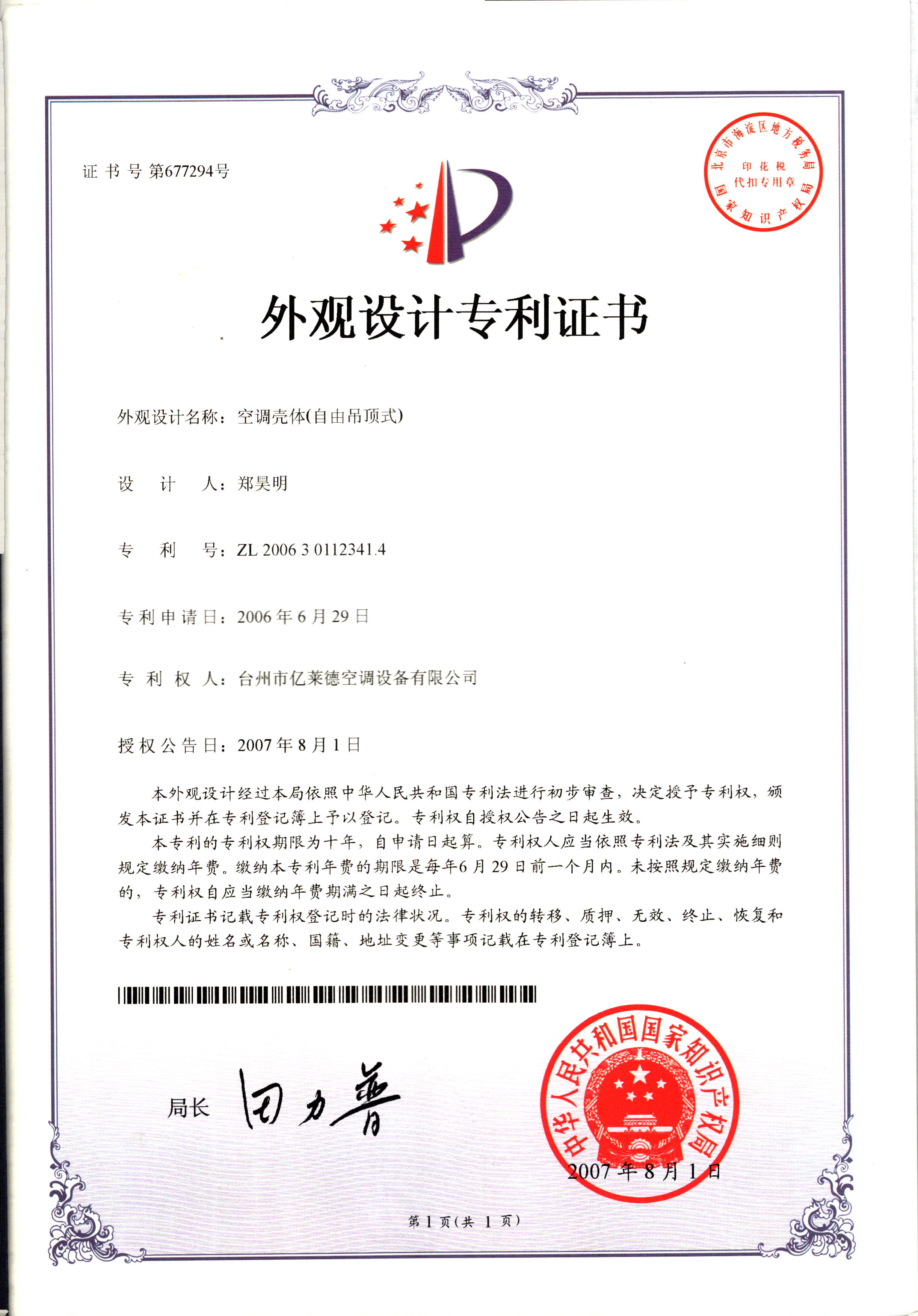 外觀設計專利證書--空調(diào)殼體(自由...