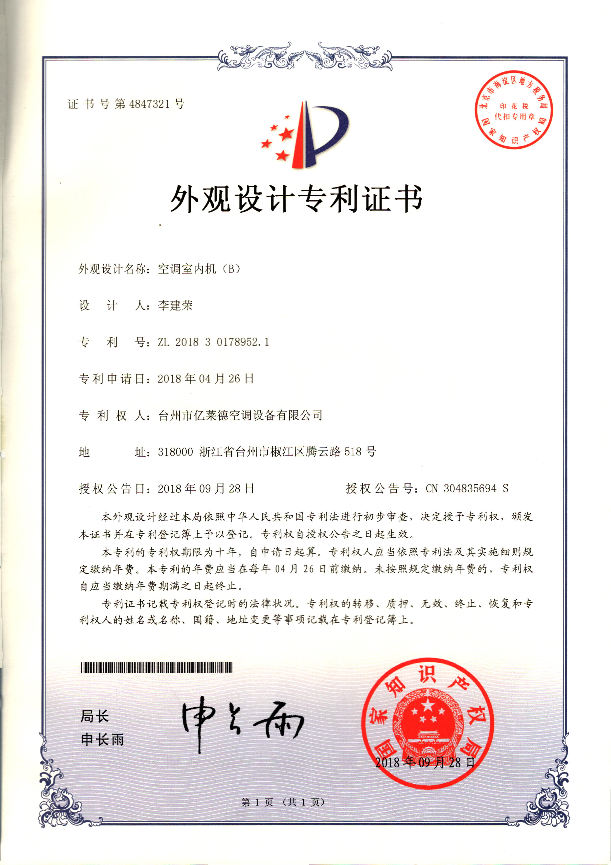 外觀設計專利證書--空調(diào)室內(nèi)機(B...