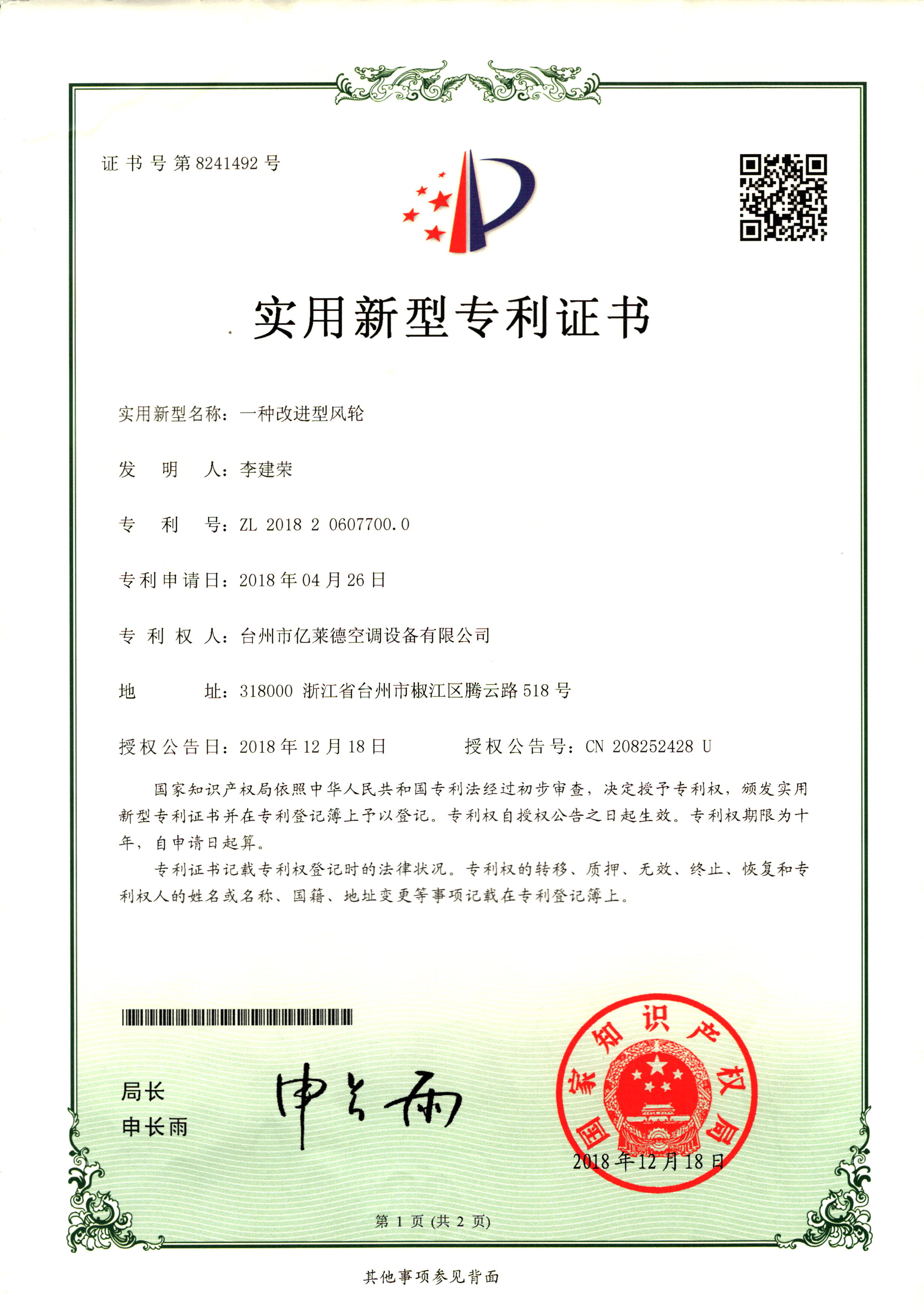 實用新型專利證書--一種改進型風...