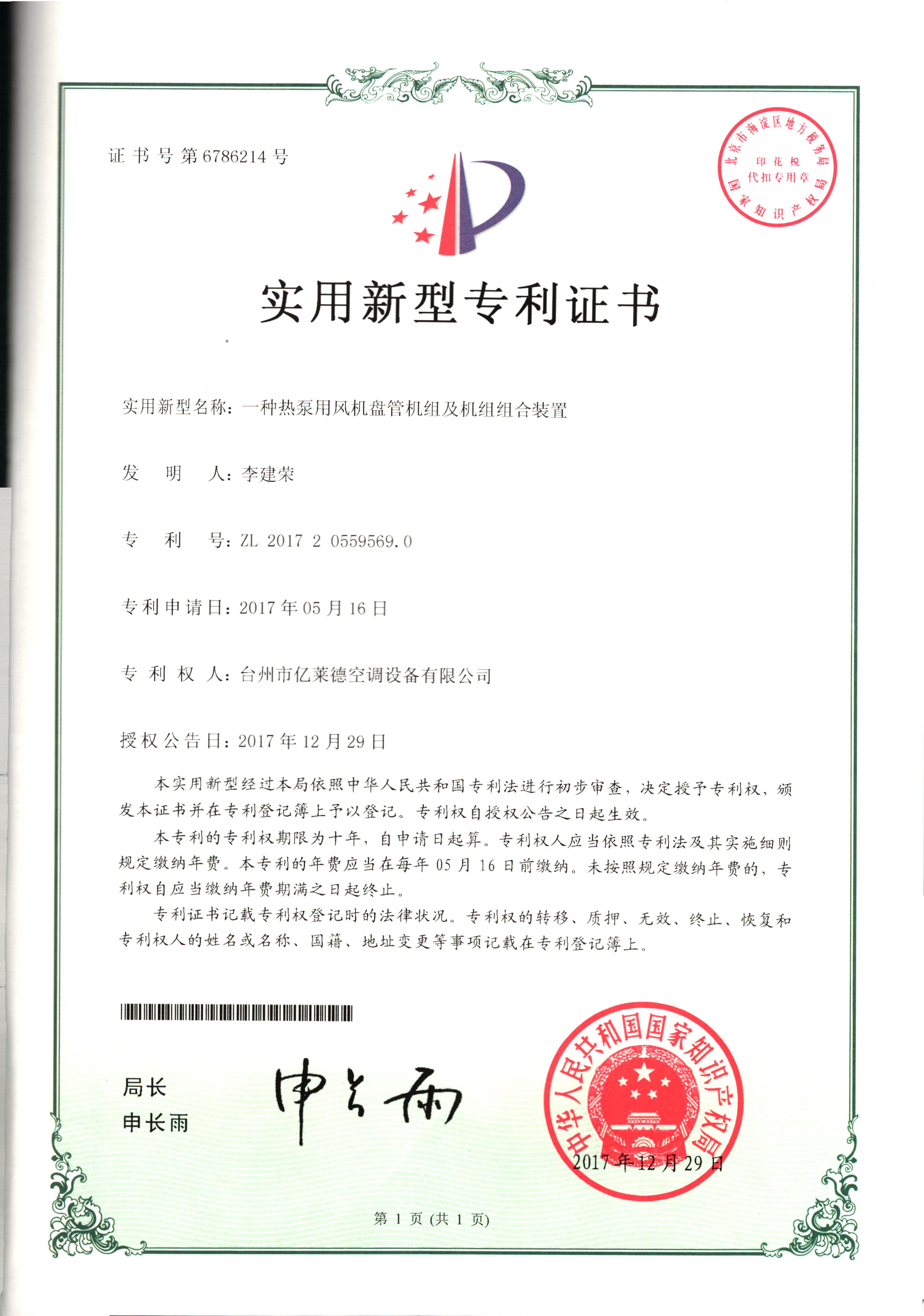 實用新型專利證書--一種室內(nèi)冷暖...