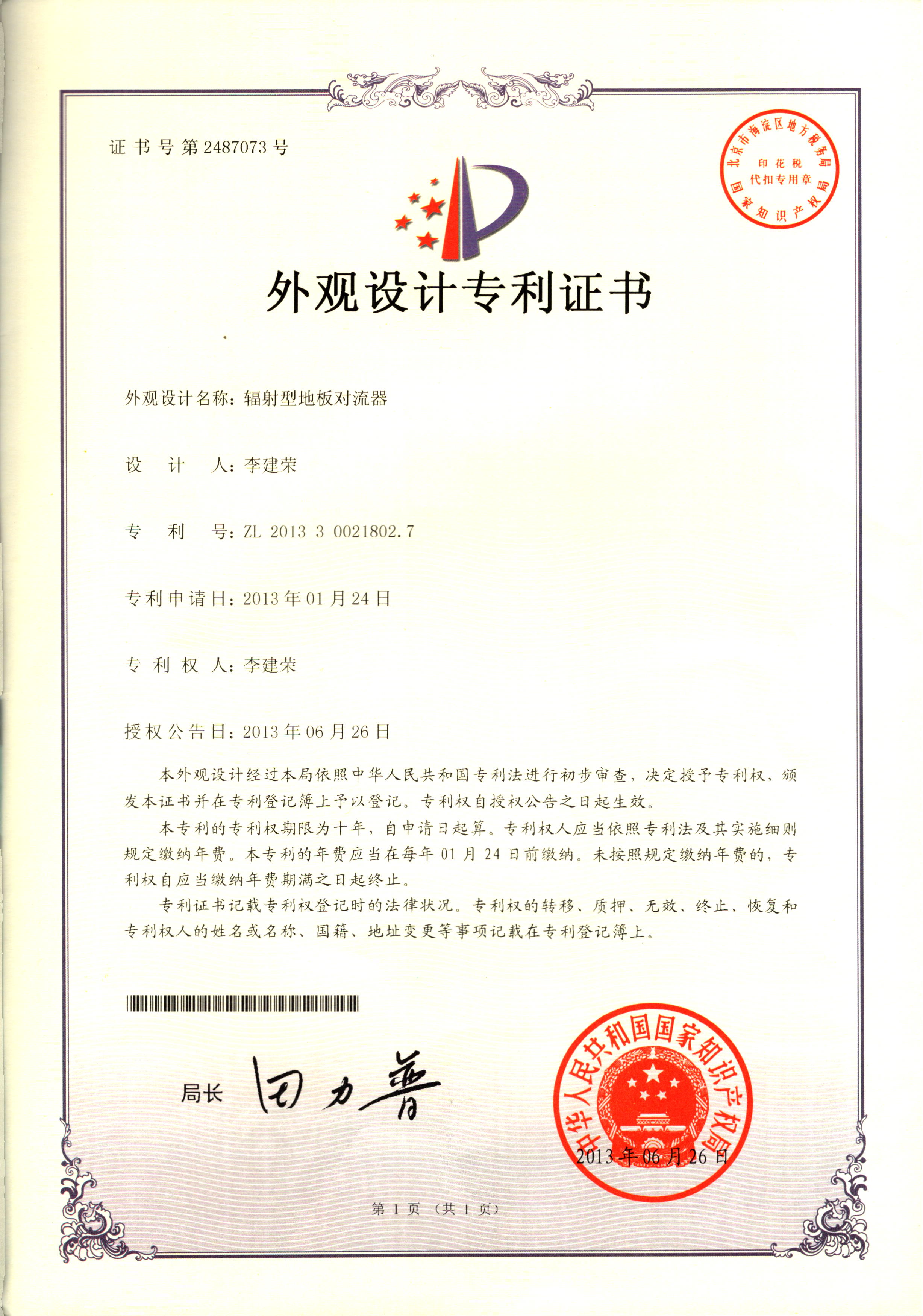 外觀設計專利證書--輻射型地板對...