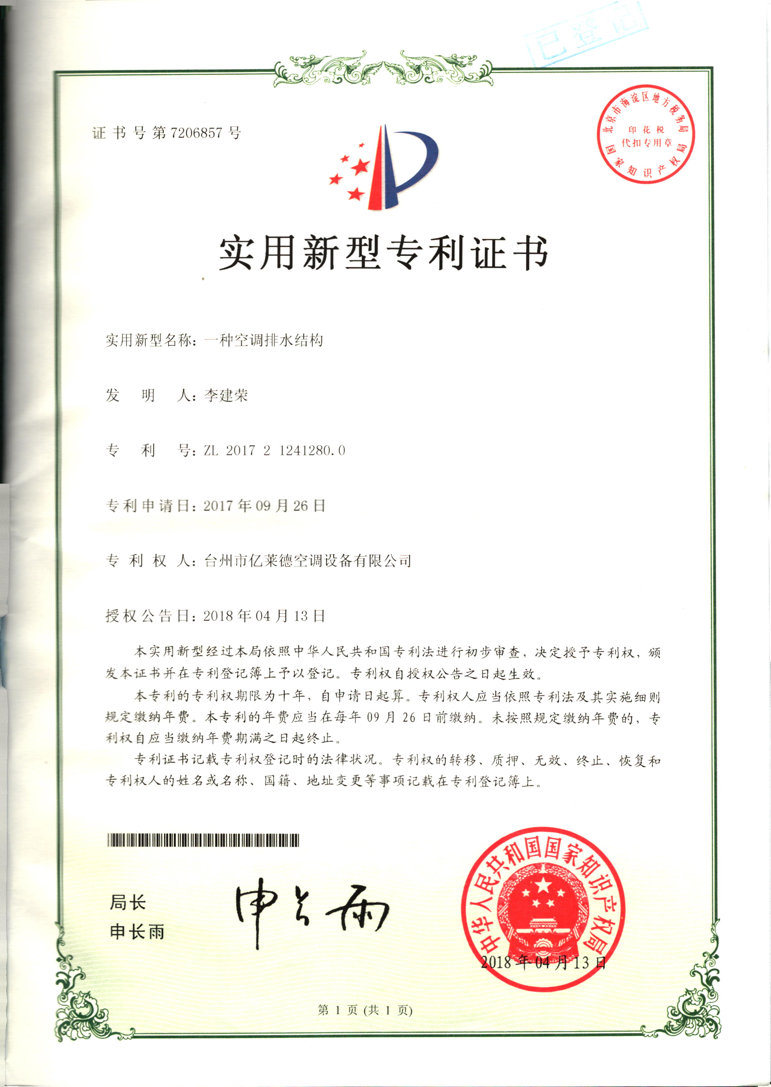 實用新型專利證書--一種空調(diào)防水...